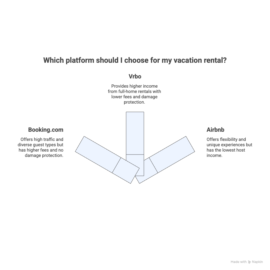 Booking.com’s massive traffic and diverse listings make it ideal for hosts with varied properties, despite higher fees. Vrbo’s lower fees, MarketMaker™ tool, and family-friendly focus deliver higher income for whole-home rentals. Airbnb, while versatile, lags in host income but shines for unique stays. VRBO vs Airbnb—compare features, fees, and revenue potential to find out which platform offers better opportunities for maximizing your hosting income.