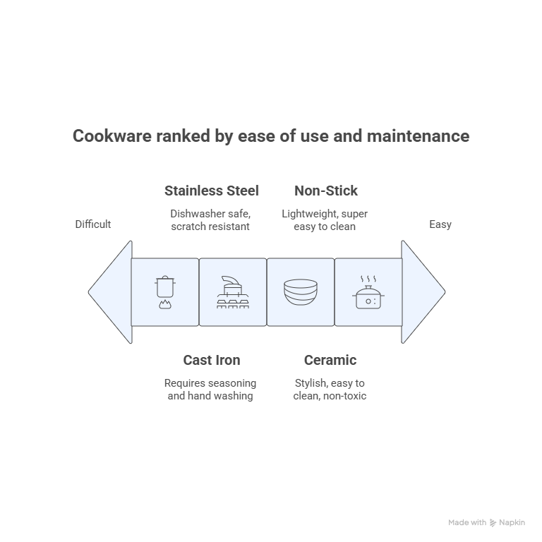 Proper care extends the life of your pots and pans. Encourage guests to avoid metal utensils on non-stick surfaces and hand wash cast iron pans. Stainless steel and ceramic cookware can handle the dishwasher, making cleanup a breeze. For stubborn burn marks or residues, using steel wool on stainless steel pans is effective and won’t damage the surface. Include a note in your welcome guide about caring for the cookware to keep it in top condition.